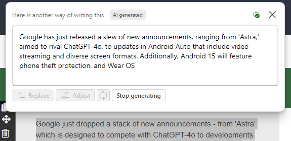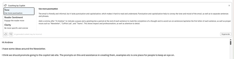 Copilot is now appearing in web-editing tools offering to rewrite content – here’s an example of it improving our newsletter content.