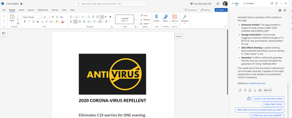 Oh, if you want to summarise an Office document without the paid version, just open the document in the online browser mode then open the free Copilot side panel. Voila! Free Copilot in a browser (Edge or Chrome) lets you summarize or ask questions about the open web page. That includes a Word document open in Word on the web.
