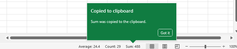 A handy feature in Excel is the ability to copy values quickly from the status bar. The status bar is the area at the bottom of the Excel window that shows information about the selected cells, such as the sum, average, count, and more. You can now select the value that you want to copy and move it to the clipboard. Then, you can paste it wherever you need in your workbook.