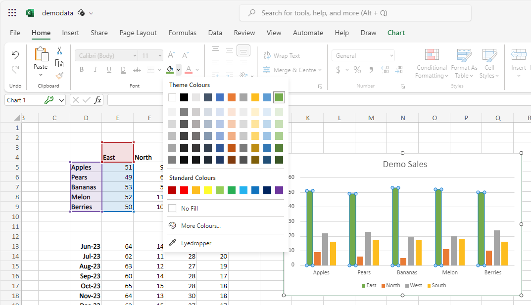 If you use Excel for web, you can now format individual data points in your charts using the Home Ribbon Controls. This can help you highlight certain data points and illustrate trends in your data. For example, you can change the color of a specific bar, column, or pie slice in your chart.
