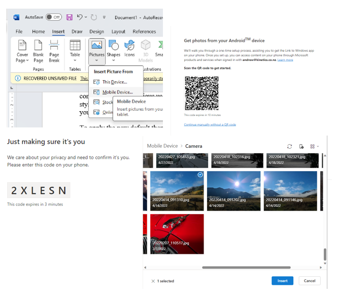 If you use Word, Excel, or Powerpoint on your Android phone, you can now easily transfer photos from your phone to your documents on Windows. This can help you save time and avoid the hassle of emailing or uploading photos to your computer. For example, you can take a photo of a receipt, a diagram, or a whiteboard with your phone, and insert it directly into your document.