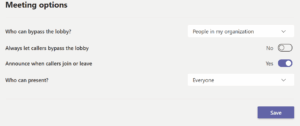 4. Auto-Lobby admission. If you have meetings with people outside your organisation, you might have noticed how sometimes people go into a ‘Lobby’ and have to wait to be accepted. That makes sense in many situations but sometimes it can be a real nuisance. You can click on the “Meeting Options’ in the appointment and change it to let people get straight in without the lobby barrier.