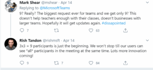 1. You can now have 9 video callers on the screen at once. This will be one of the most popular features in the next update of Teams. For now, you turn it on manually, and in time this will become the default. Just be aware that the more video feeds, the more internet performance is required. Microsoft say that it will automatically adjust the number of video feeds to optimise your experience, but we’re yet to use this enough to get a clear assessment of that. The worst case scenario is that you have to turn out the number of feeds for some meetings – that seems perfectly acceptable. There is more coming, with a tweet from Rish Tandon (Microsoft CVP Engineering for Microsoft Teams) promised they will soon let us see ALL participants in the meeting at the same time .