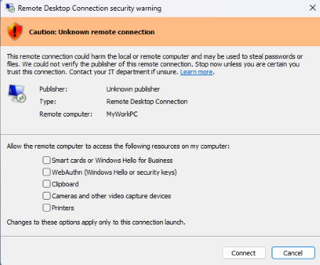 The first time you open an RDP file after installing the update, Windows displays a one-time educational prompt that explains what RDP files do and the risks. From that point on, every RDP file you attempt to open will trigger a security dialog before any connection is established. That dialog tells you whether the file has been digitally signed by a verified publisher, shows you the address of the remote system you are about to connect to, and lists every local resource that the file is trying to redirect, including drives, clipboard access, and connected devices. Crucially, all those redirections are off by default, meaning nothing is shared unless you actively choose to allow it.