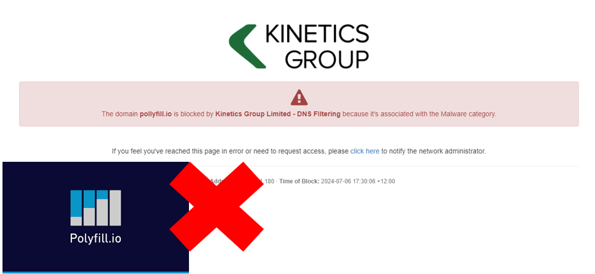 Many websites are built on common components. One of those is called “Polyfill” (pollyfill.io) and it is reportedly present in approximately 3,4% of all websites. Over recent days, our systems automatically blocked access to any site built with this.